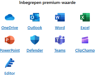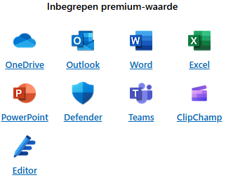 • Premium desktop-, web- en mobiele versies van Word, Excel, PowerPoint, OneNote en andere apps